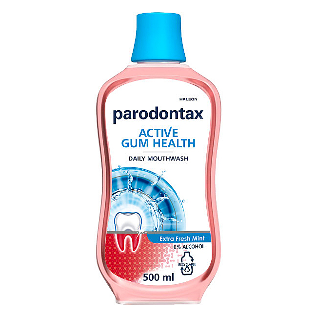Parodontax Active Gum munskölj 500ml ger 3xbättre plackborttagning jämfört med enbart tandborstning. Fri från alkohol, innehåller zink för en god andedräkt. För ett friskt tandkött och starka tänder.