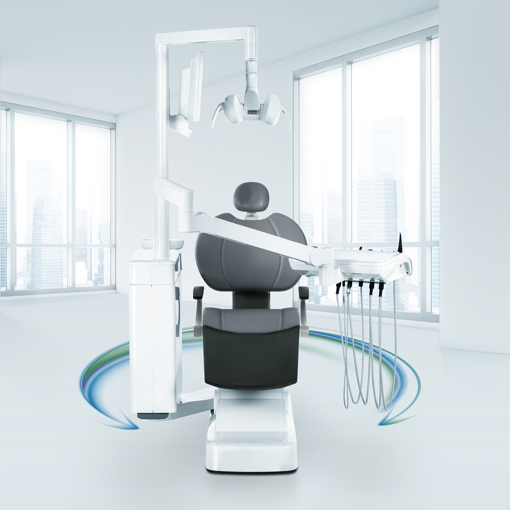 > Behandlingsstolen står alltid på samma plats vilket ger dig oförändrad närhet till skåpinredning och fast installerad utrustning, såsom intraoral röntgen m.m.