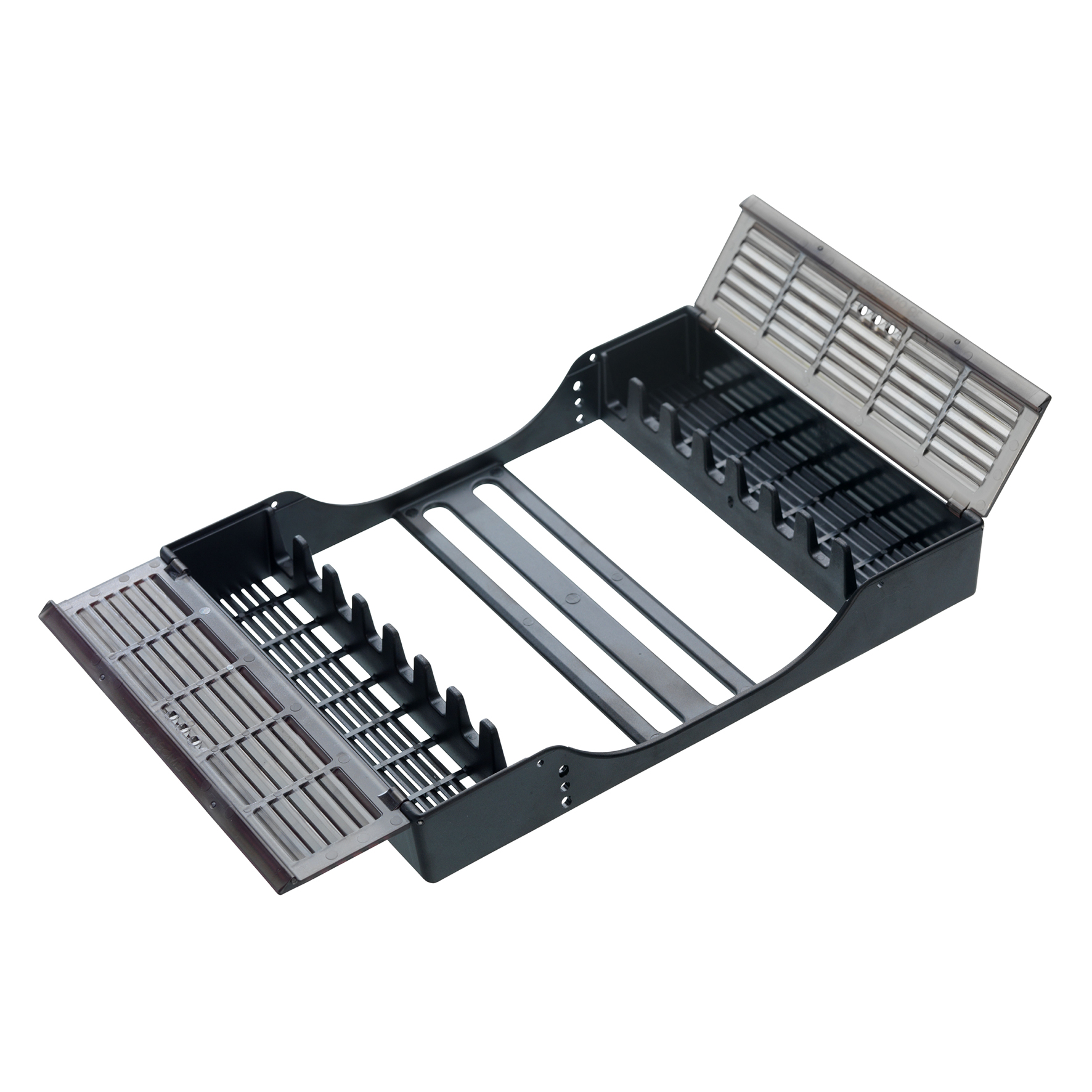 För 8 instrument, med låsbar bygel. Tillverkad av fiberförstärkt svart plast. E-brickorna har färgade säkerhetsskydd som förhindrar stick och skärskador samt skyddar instrumentspetsarna. Autoklaverbar max 180 grader . Mått kassett 180 x 133 x 26 mm. Grå