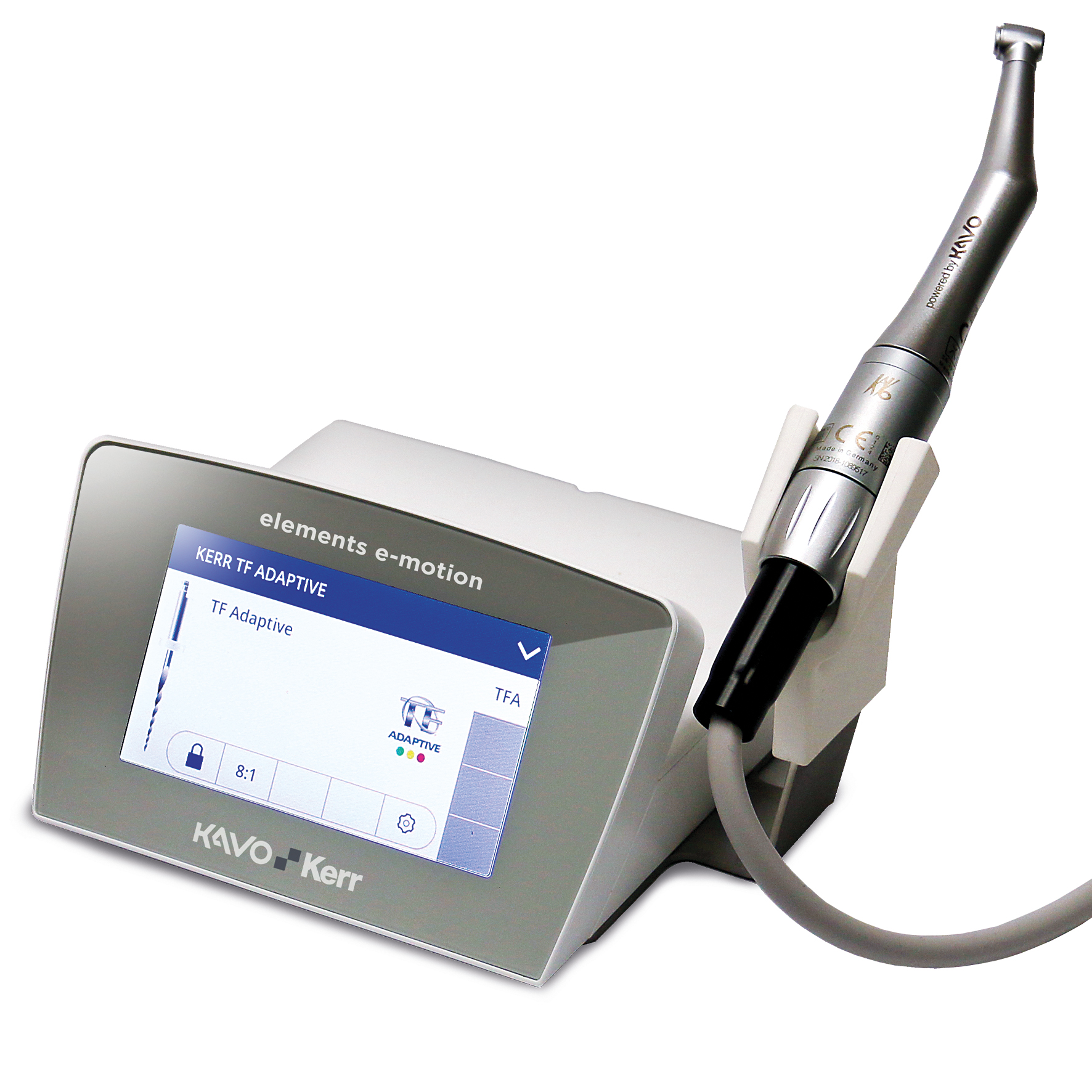 Kerr elements e-motion är till fullo designad och tillverkad i Tyskland, och levereras med ett vinkelstycke i rotsfritt stål, tillverkat av KaVo. Enheten är intuitiv att använda tack vare användarvänlig färgpekskärm och ett gränsnitt med 5 st förinställda men med 10 parametrar vardera fullt justerbara program.