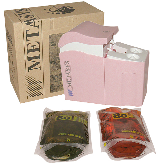Metasys Green & Clean M2 rengörings- och desinfektions-medel för sugsystem. Dualsystem för att förhindra bakteriell resistens, röd & grön. Drygt – 4 påsar räcker till 320 rengöringstillfällen.