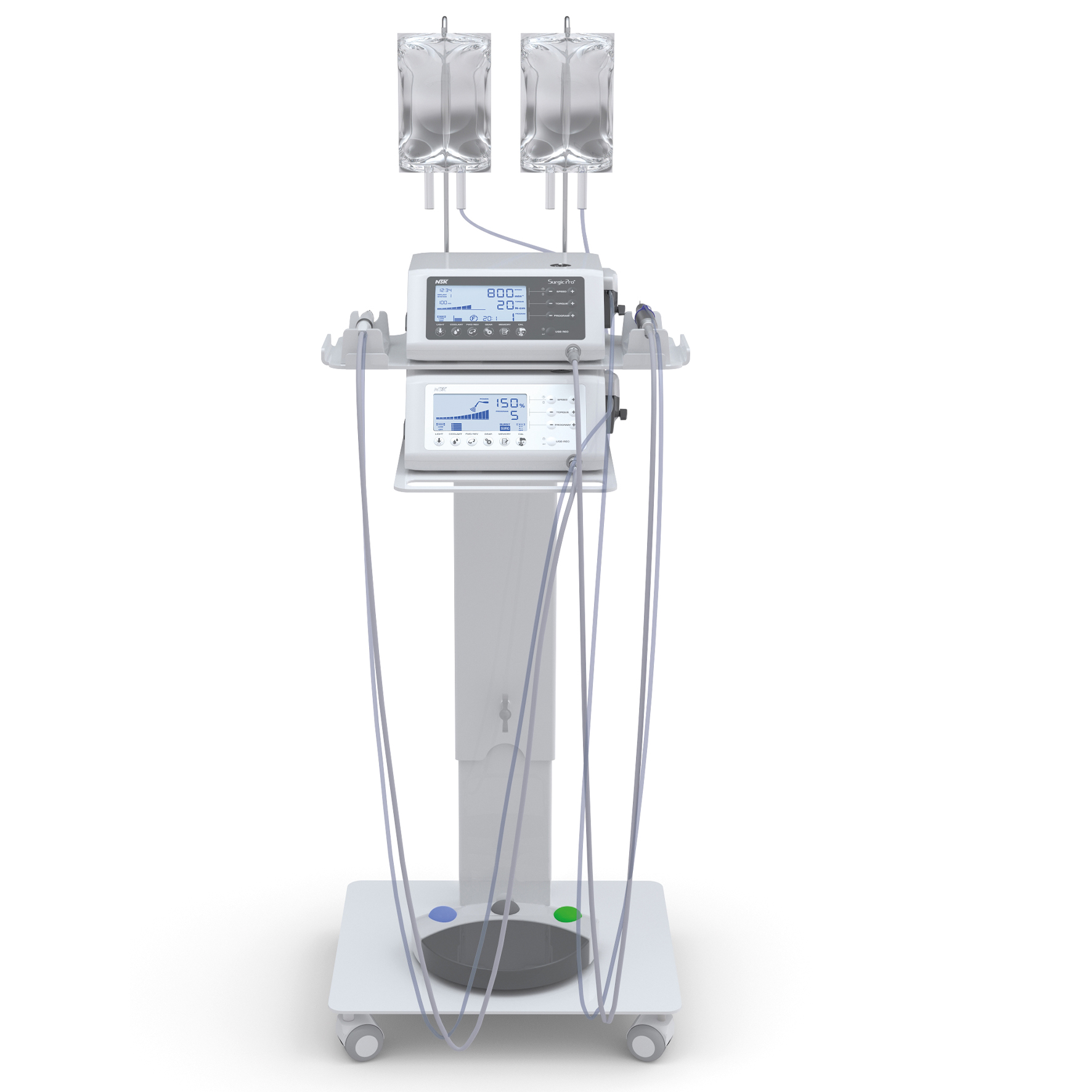Praktisk vitlackerad cart med skräddarsydda platser för kirurgi-/implantatenheten Surgic Pro2 och enheten för benkirurgi VarioSurg 3 alt. 4 inkl. tillbehör.