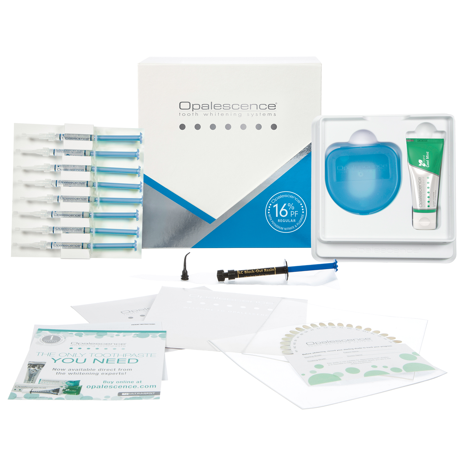 Opalescense 16% PF (kaliumnitrat och fluor) ger den mest skonsamma blekningen och rekommenderas som förstahandsval vid hemmablekning eftersom den har påvisat att den snabbast ger bästa möjliga resultat - en varaktig blekningseffekt som inte torkar ut tänderna. Minimeras risk för sensibilitet. Behandlingstid: 2x30 min per dag eller upp till 8 timmar per natt. Färdigt resultat för normal patient: 8-12 dagar eller 3-7 nätter. Smak: regular Innehåll: 8st gelsprutor, 8st kanyler 2st sof-trayskedar 0,9mm 13X13 cm 1st 1,2ml förfylld lcc block-out resinspruta 1st färgskalekort, 1st förvaringsask 1st Opalescense tandkräm Ultradent ref.nr. 4485 Doctors kit
