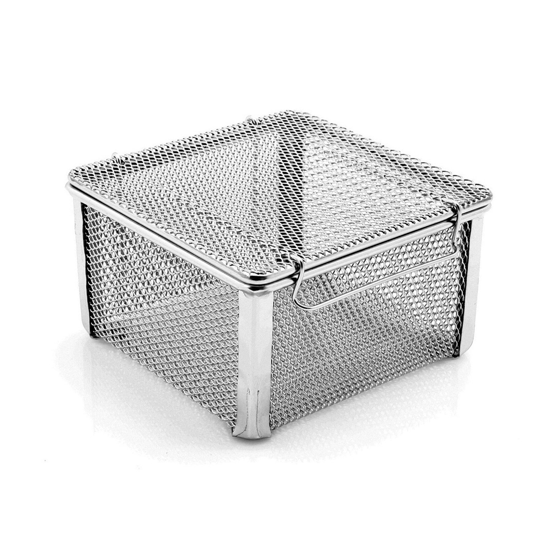 Smådelskorg med lock, i rostfritt stål. Finmaskigt nät i lock, botten och sidor.
