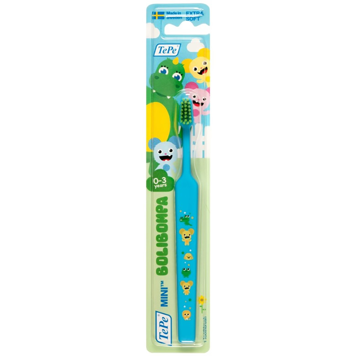 TePe Mini™ Bolibompa är en hållbar tandborste som kan användas från första tanden upp till 3 års ålder. Den har lekfulla Bolibompamotiv för roligare tandborstning. Tandborsten har ett avsmalnande borsthuvud och extra mjuka strån för skonsam rengöring av barnets första tänder. Skaftet ger ett bekvämt grepp för barn och vuxna som hjälper till med tandborstningen. Skaftet kan vinklas efter uppvärmning i varmt vatten. 14 st i en kartong