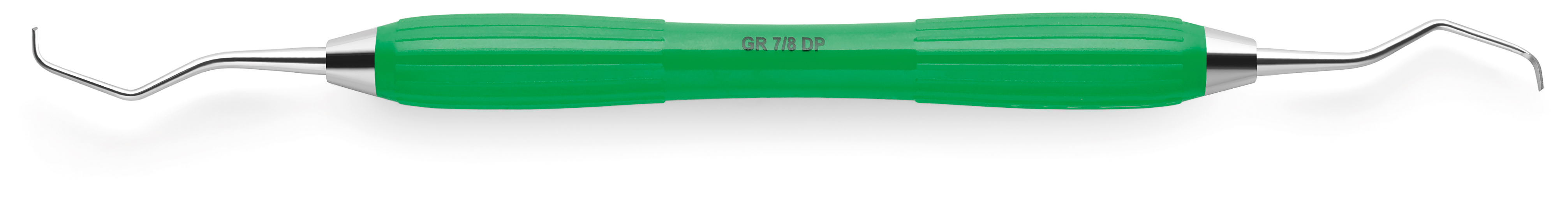 För avlägsnande av subgingival tandsten och finishering av subgingivala rotytor på premolarer och molarer. Längre arbetsdel. Silikonhandtag, stålkon mellan arbetsdel och silikonhandtag. Diameter grepp: 11,5mm. Grön