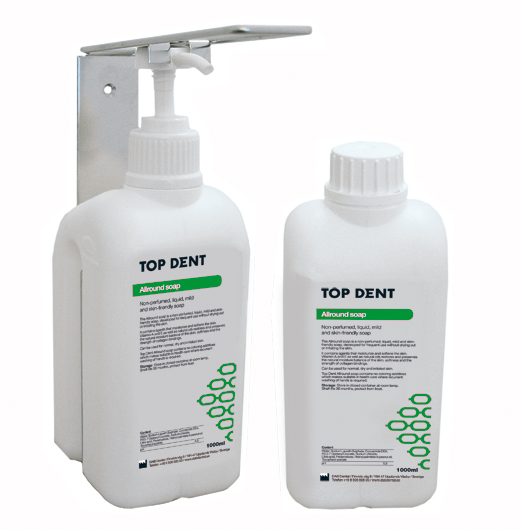 Pump till 1 l flaska Allroundtvål. Top Dent Allroundtvål är en oparfymerad, flytande, mild och hudvänligtvål, framtagen för att kunna användas ofta utan att torka uteller irritera huden. Top Dent Allroundtvål kan användas tillhela kroppen.Den innehåller ämnen som fuktar och mjukgör huden.Vitamin A och E samt naturliga oljor återställer och bevararhudens naturliga fuktbalans, mjukhet och styrkan ikollagenbindningarna. Kan användas på normal, torr och skadad hud. pH 5,5.