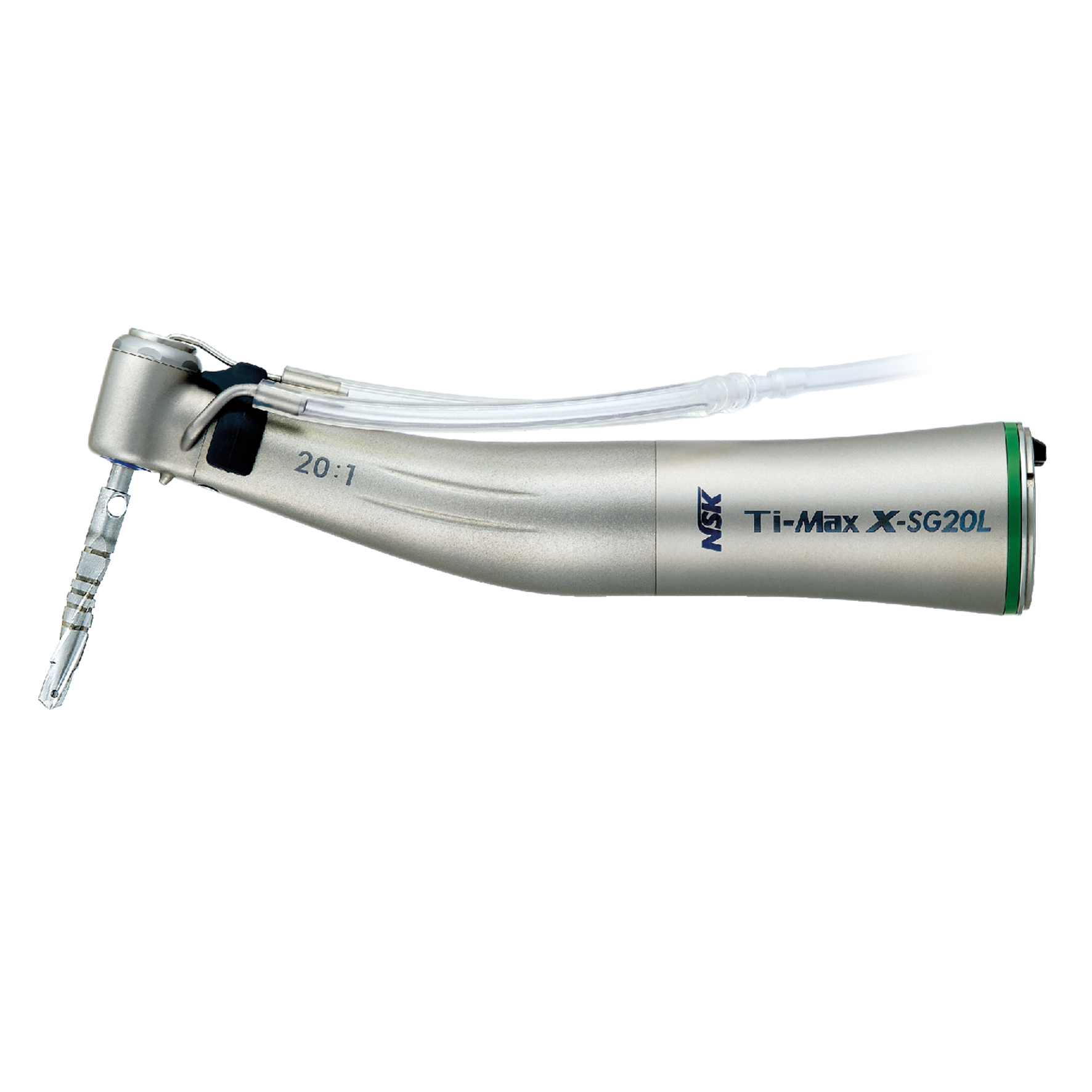 Ti-Max X - SG20L Ett nedväxlat (grönt) kirurgivinkelstycke ur NSK's toppserie Ti-Max. Tillverkat i titan med Duracoat ytbeläggning, dubbeltätat huvud och kraftig växellåda gör det extremt stryktåligt och lätt att hålla fast.